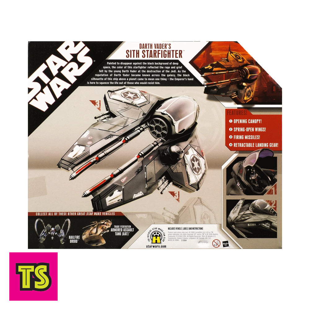Equipped with a removable canopy, spring-open wings, retractable landing gear, and firing blaster cannons, this starfighter reflects the fear and rage of the Sith Lord himself. With its ominous black and crimson paint, this ship was made to dominate the skies—just like Vader did.